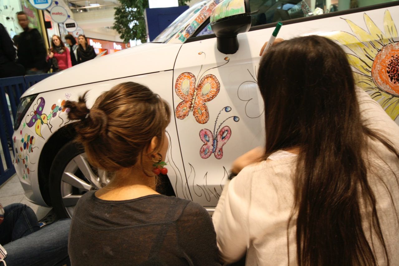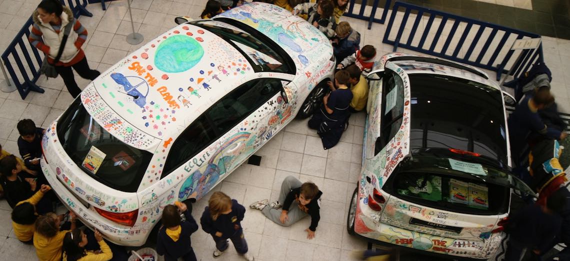 Instead of simply designing a futuristic car shape, children drew a complete "green" setting on the two cars, a SMART Fortwo and an Audi A1.